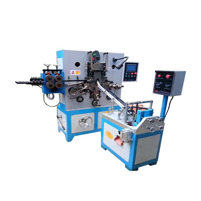 Гибочная машина для крючков XJ-SH5 использует в производственном цикле проволоку из чёрного или цветного металла. Проволока подаётся в операционный комплекс №1 из бухтодержателя. Проходя через линию выравнивателей, она попадает в матричную область, где под воздействием гидравлики получает нужную форму. Далее, заготовка поступает в модуль №2, где происходит накатка резьбы. Затем готовая продукция отбрасывается в сборочный лоток.