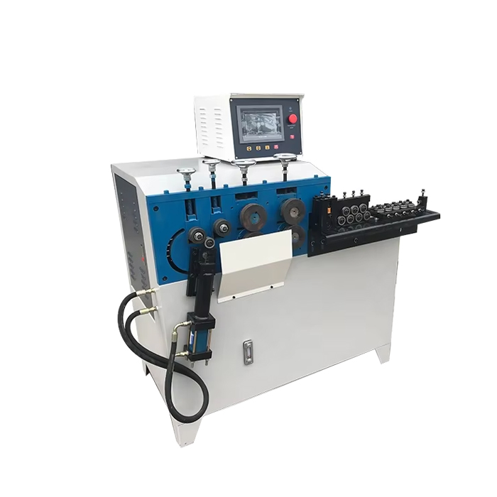 Оборудование для формовки колец из проволоки DQ2-6 оснащается программируемым логическим контроллером, отвечающим за точную регулировку работы приводов. Данные в ПЛК заносятся через операционный модуль с цветным сенсорным экраном. Немедленно остановить процесс можно с помощью ярко выделенной красной кнопки обесточивания.