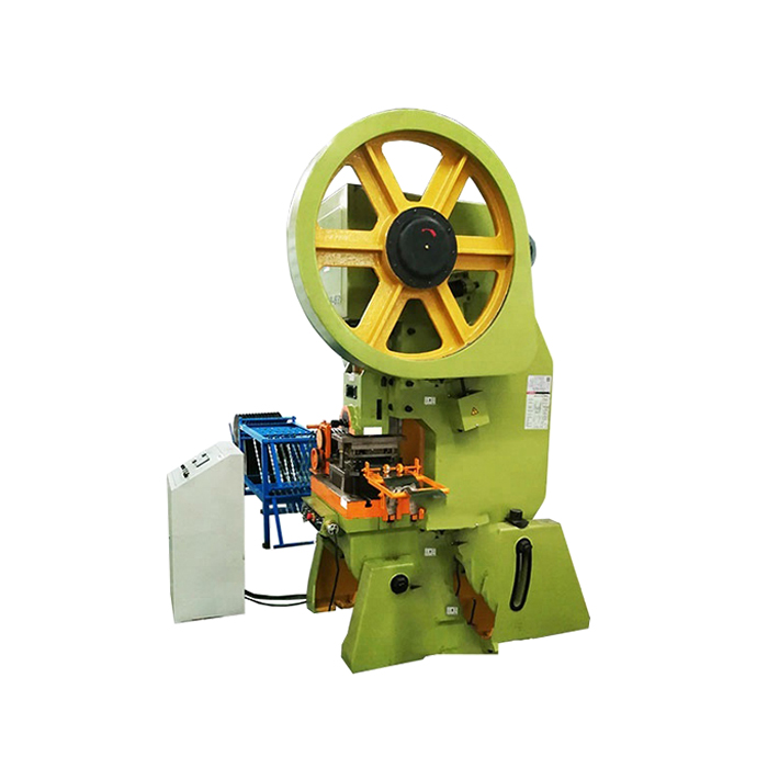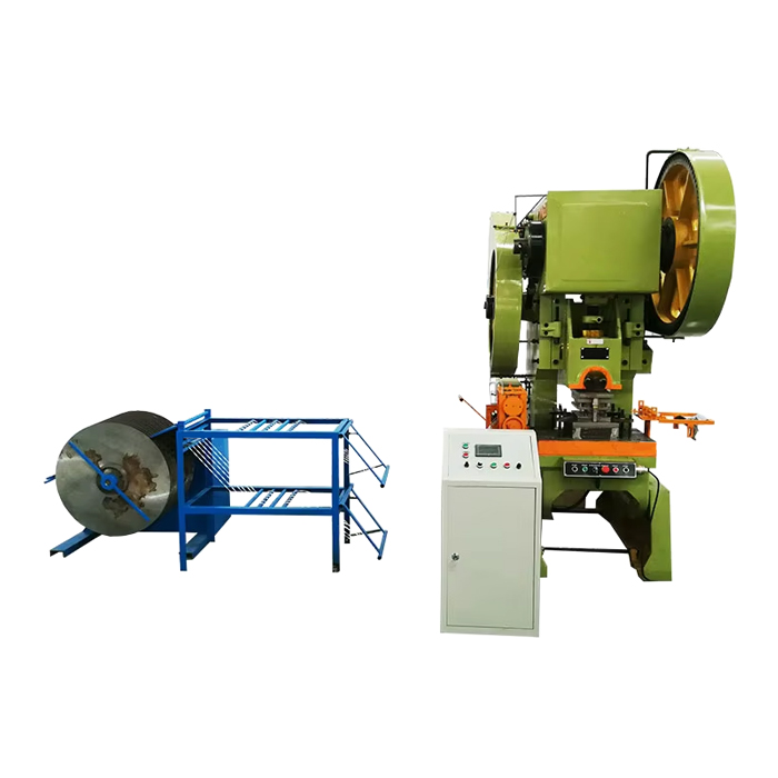 Полотно поступает в операционную зону из разматывающейся катушки. Вертикальный гидравлический пресс с С-образной операционной зоной с пошаговым движением с помощью режущей матрицы высекает рисунок лезвий, одновременно разделяя полотно на ленты, которые в шахматном порядке выводятся из зоны обработки часть вниз, а часть – вверх. Проходя через систему натяжения с «танцором», ленты накручиваются на свои катушки без провисания.